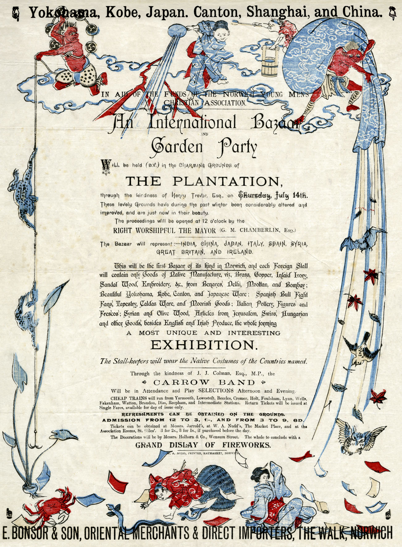 This poster advertises ‘An International bazaar and Garden Party’ to be held in The Plantation ‘through the kindness of Henry Trevor Esq.’ in aid of the Y.M.C.A. Stalls represented goods from various countries (ivory from Bombay, Japanese wares, Spanish fans etc) with stallholders dressed in ‘Native Costumes’. The Carrow band and fireworks were added attractions.